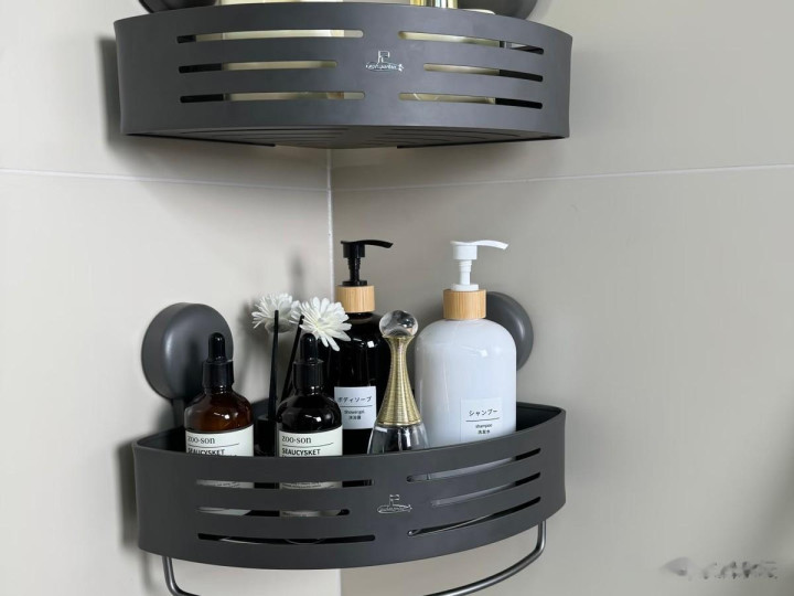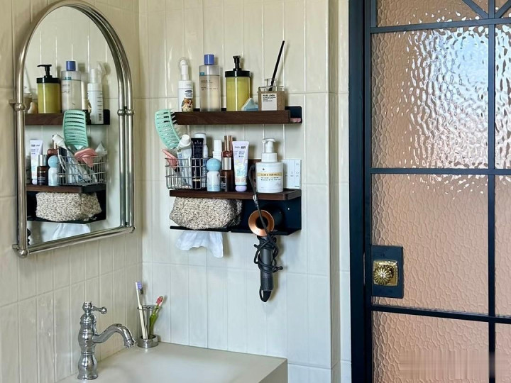 卫生间的收纳,如故优先接头外置收纳,举例转角架,壁挂架,便捷又实用。