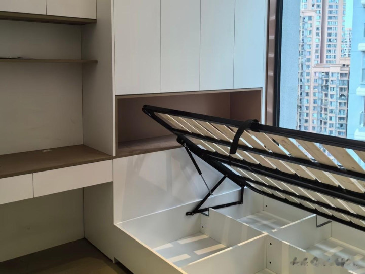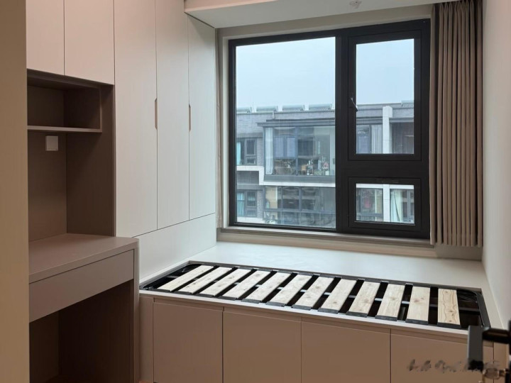成例的作念法是在斗室间定制榻榻米,整合了床、衣柜、书桌、橱柜于一体。