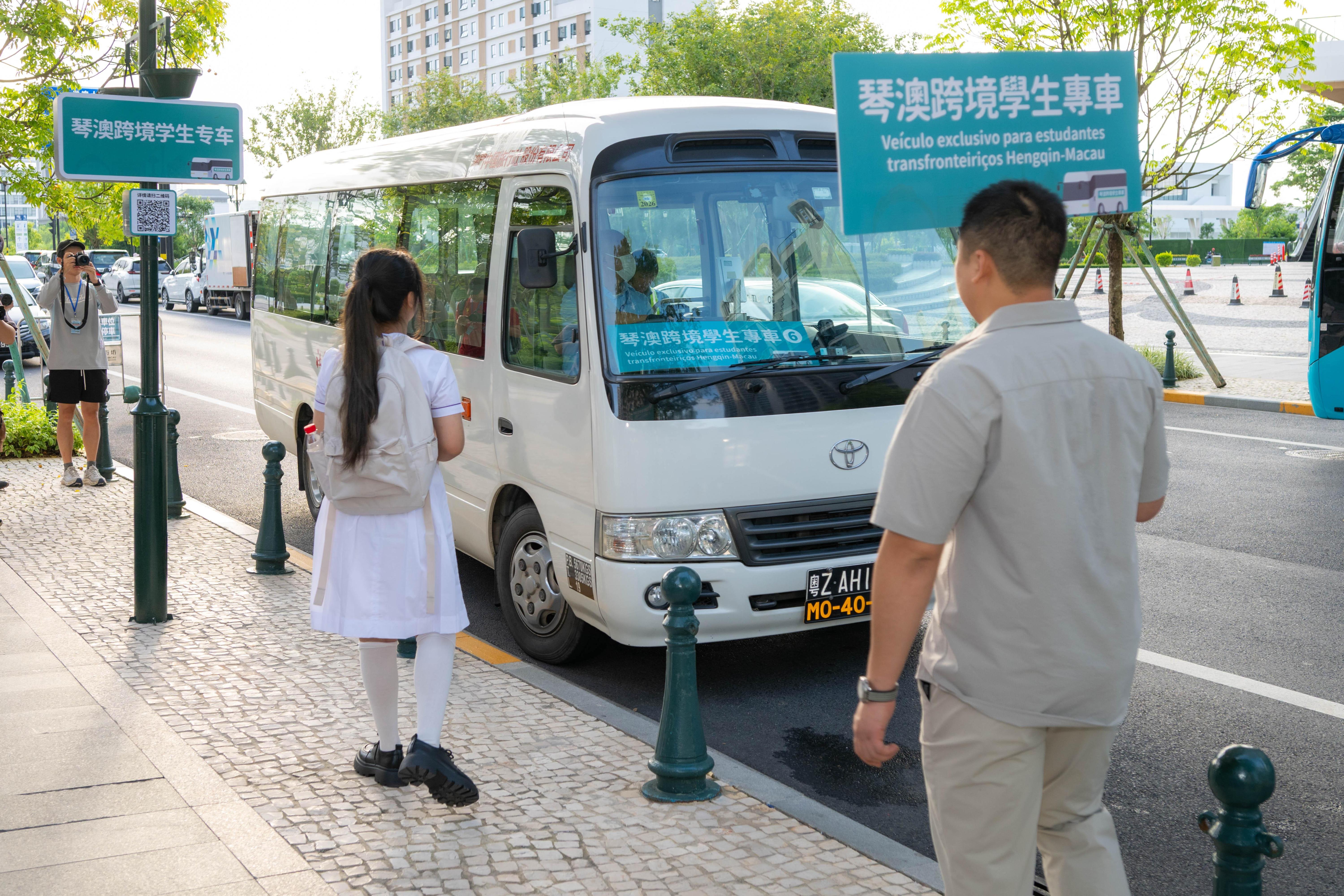 澳琴跨境学童专车试行随车稽查(免下车通关)方式,便利学生跨境上学。(图片开端:澳门新闻局)