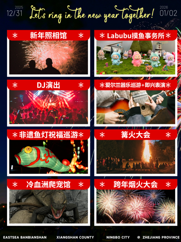 12月31日,咱们邀请通盘东谈主免费加入。你不错走进象山非遗的鱼灯光影里,找回童年回顾的倒影;手提一盏鱼灯或马灯,加入巡游的队伍,沿着海岸散步;在凯尔特风笛的旋律中,听见来自远处的共识;在祝福墙上写下愿望,与Labubu合影眷恋;在跃动的跨火盆典礼前,亲手把缺憾燃成灰烬。直到零点钟声敲响,看烟花从海面腾空盛开。
