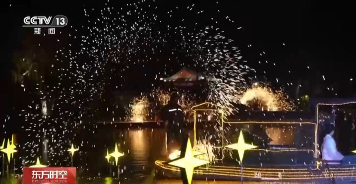 夜幕来临,泉水灯光秀、打铁花等名堂轮替献艺。光影交汇间,古城韵味与节日氛围拉满,引得游东说念主藏身不雅赏。