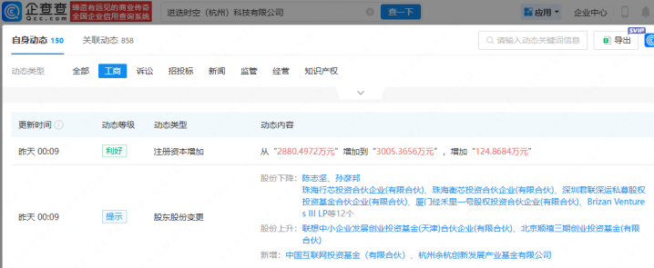 企查查APP露馅,近日,进迭时空(杭州)科技有限公司发生工商变更,注册成本加多至约3005.37万元,新增中国互联网投资基金(有限结伙)、杭州余杭改进发展产业基金有限公司为鼓励。