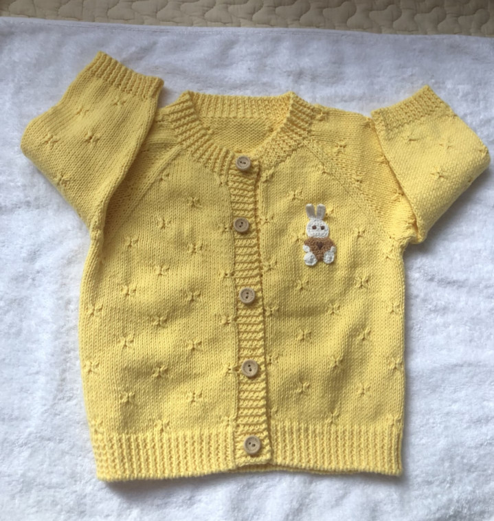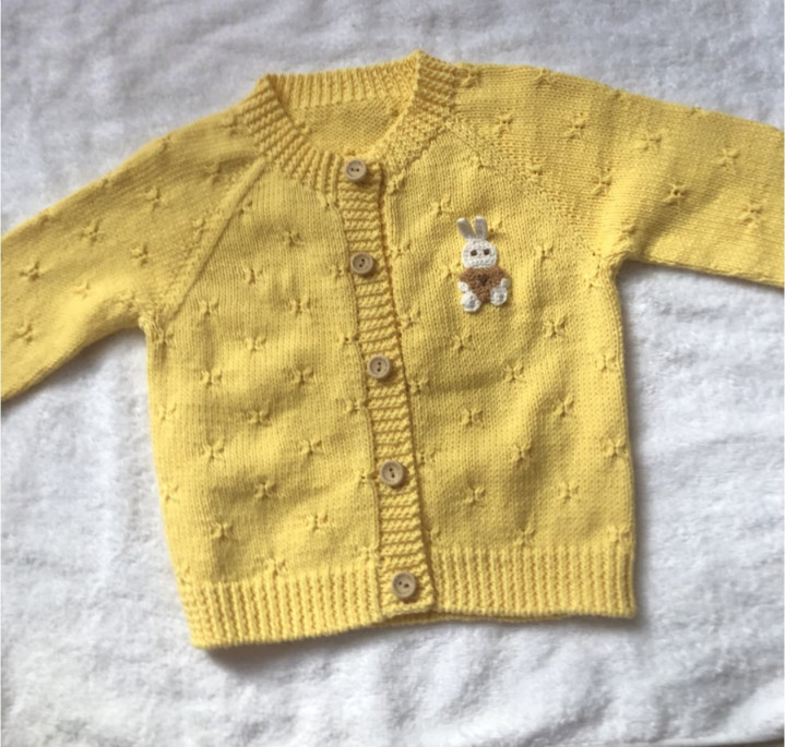 就这么前前后后差未几花了五天的工夫,这件毛衣终于完工了,这是一件黄色的毛衣开衫,我还在胸口的位置还缝了一只小兔子,看着相配可儿。